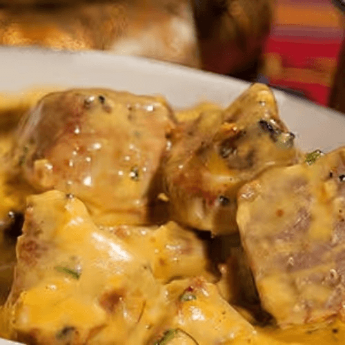 Kids favorite. Chicken thigh meat cooked in a thick mango sauce