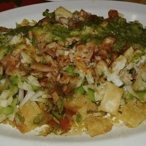 Crispy vegetable samosas chopped and topped with onion, cilantro, green bell peppers, yogurt, green peas, tamarind and mint chutney