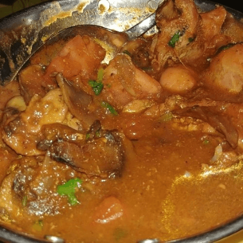 Boneless chicken thigh meat cooked in a thick sauce with fresh mushrooms, tomato and onion paste and curry spices