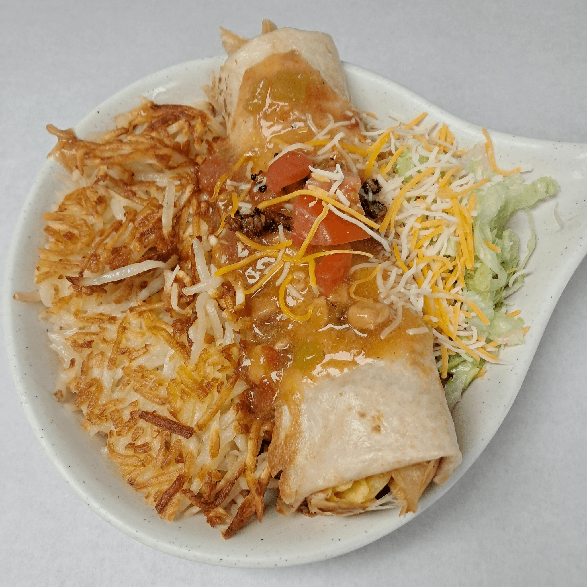Eggs, chorizo, cheddar, green chile, hash browns, lettuce, tomato