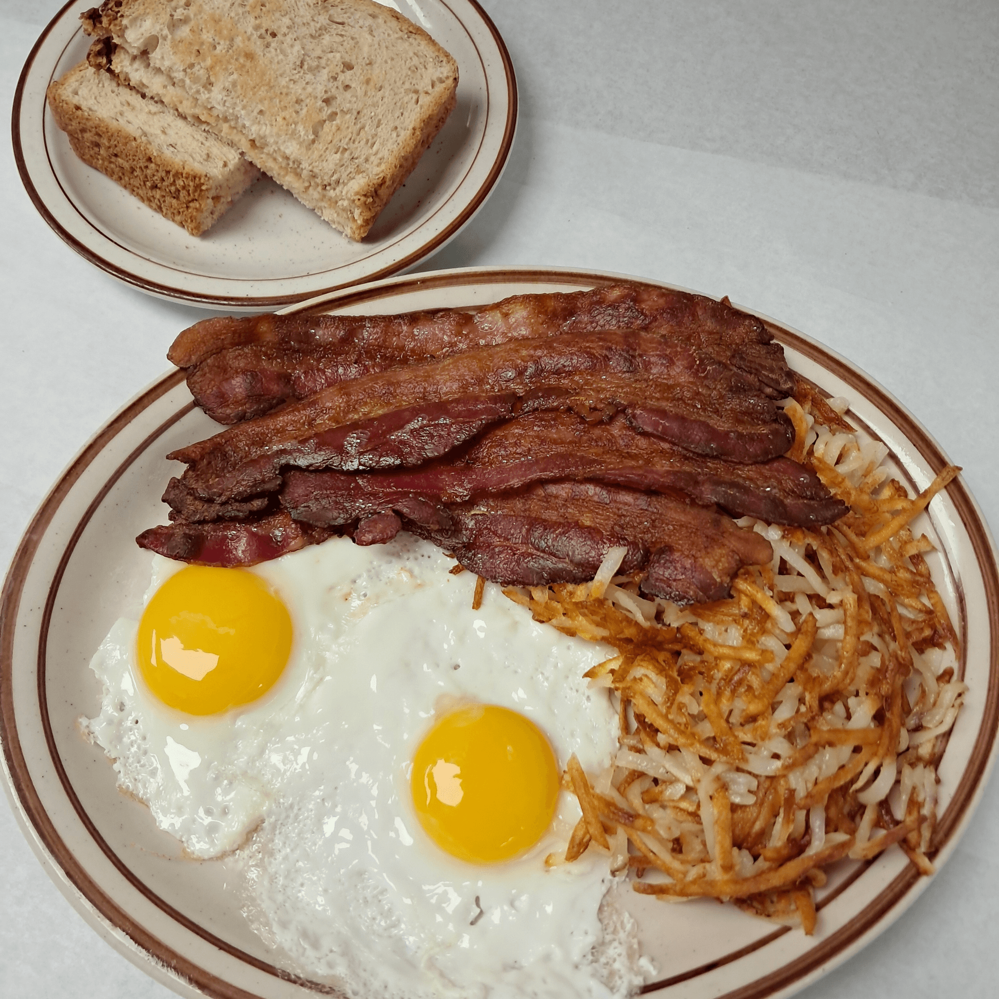 1 egg, choice of 2 bacon, 2 links or 1 bratwurst, hash browns & toast