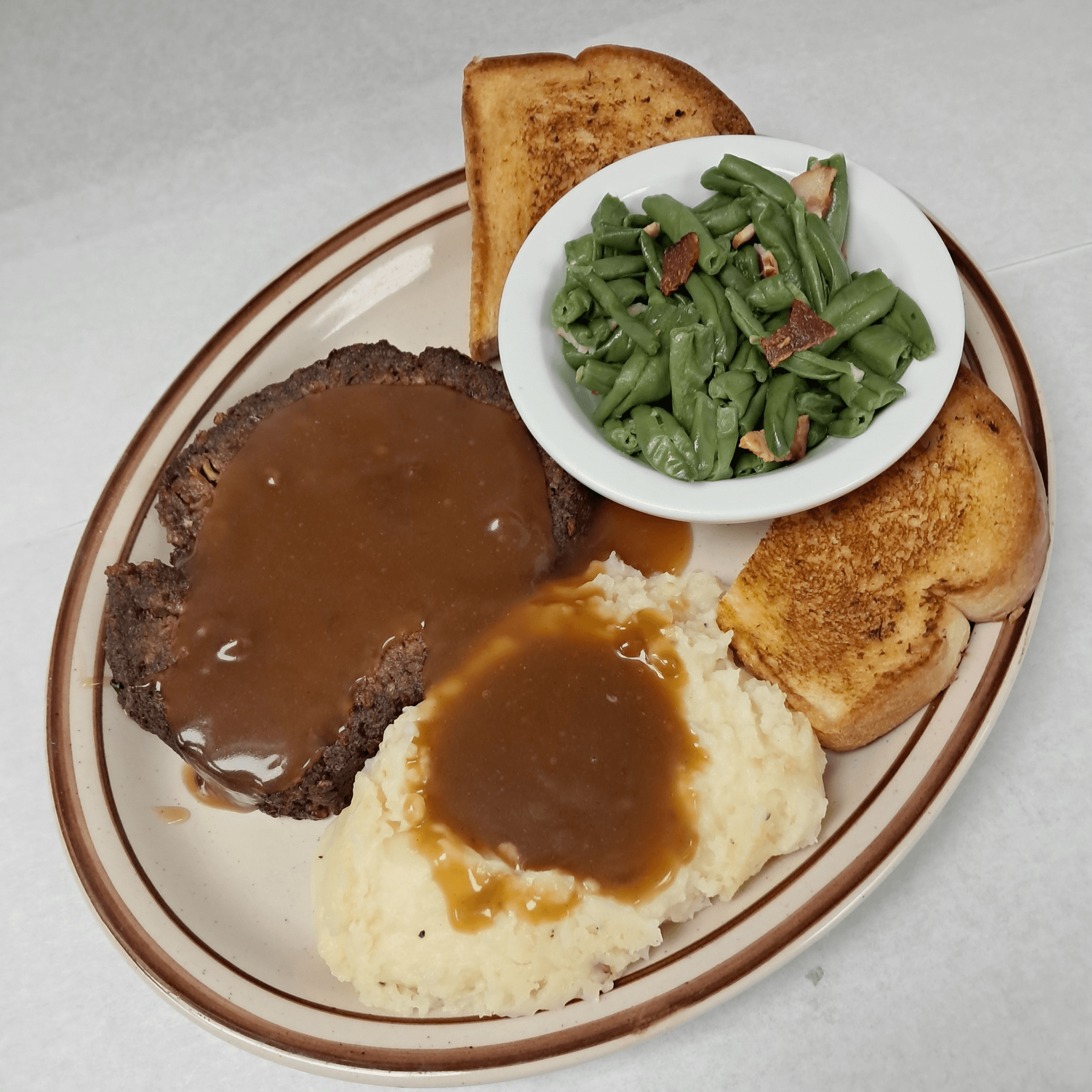 Beef, brown gravy. Includes garlic toast