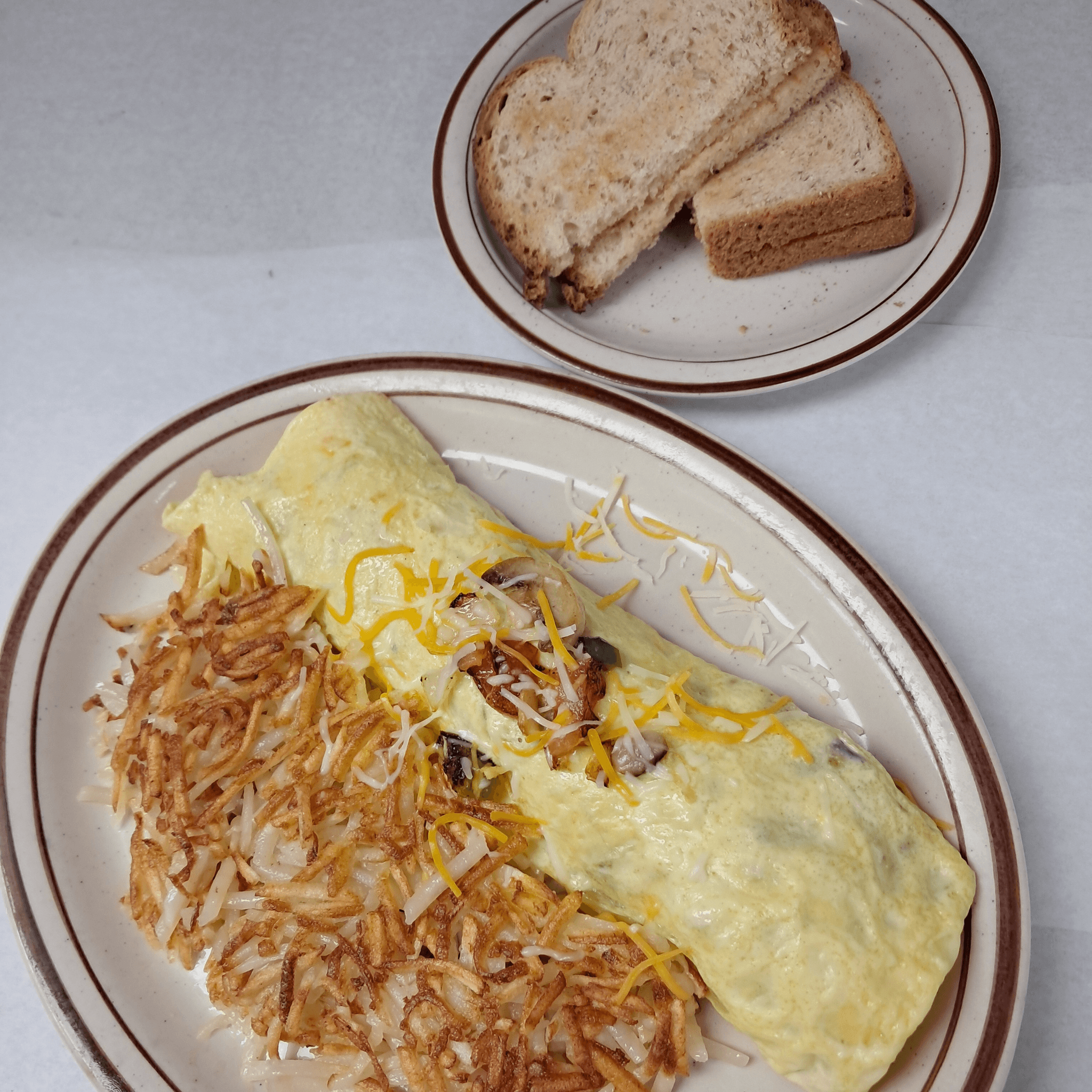 It comes with hash browns and toast. Select your 5 toppings