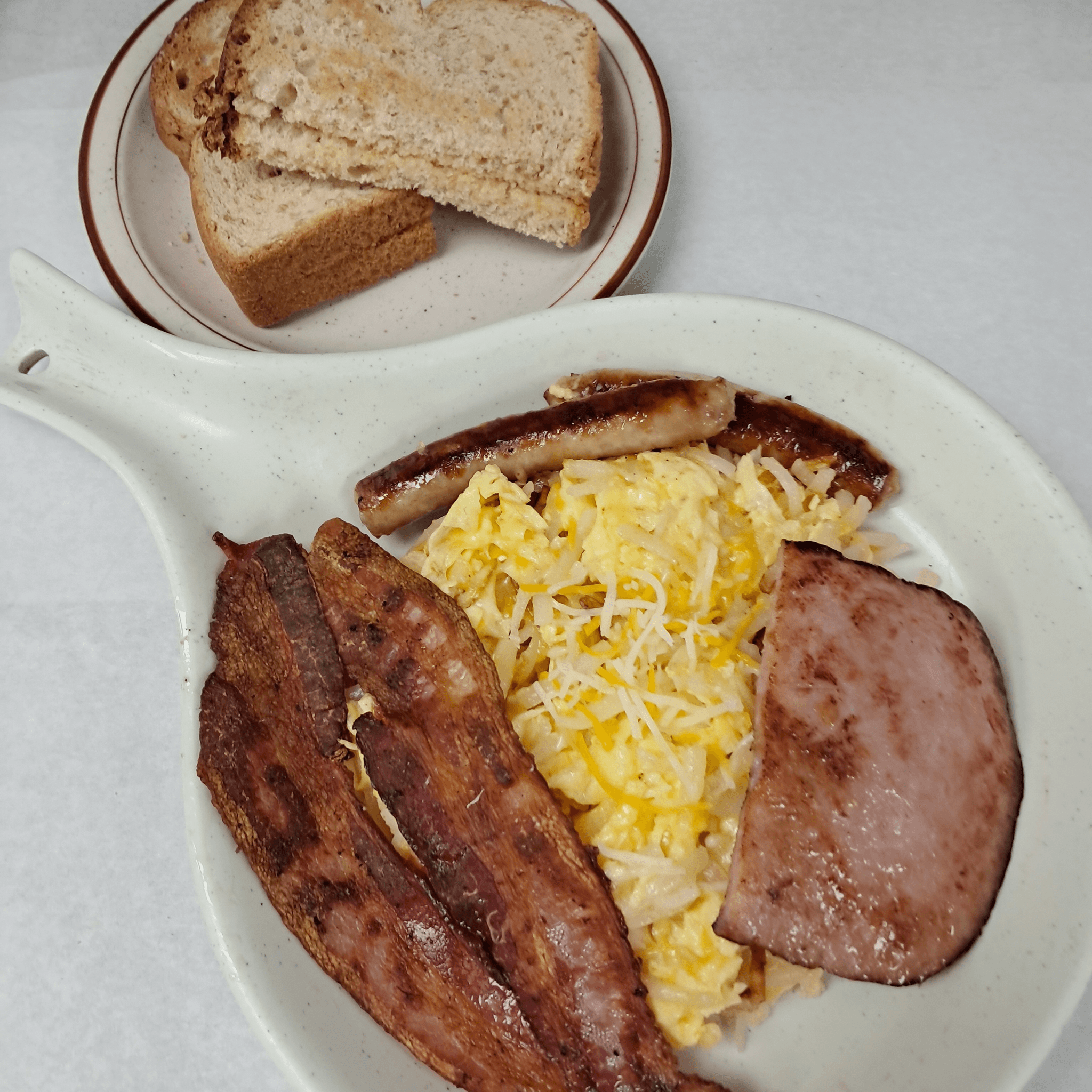 3 eggs scrambled with hash browns & onions, sausage, bacon, ham, cheddar