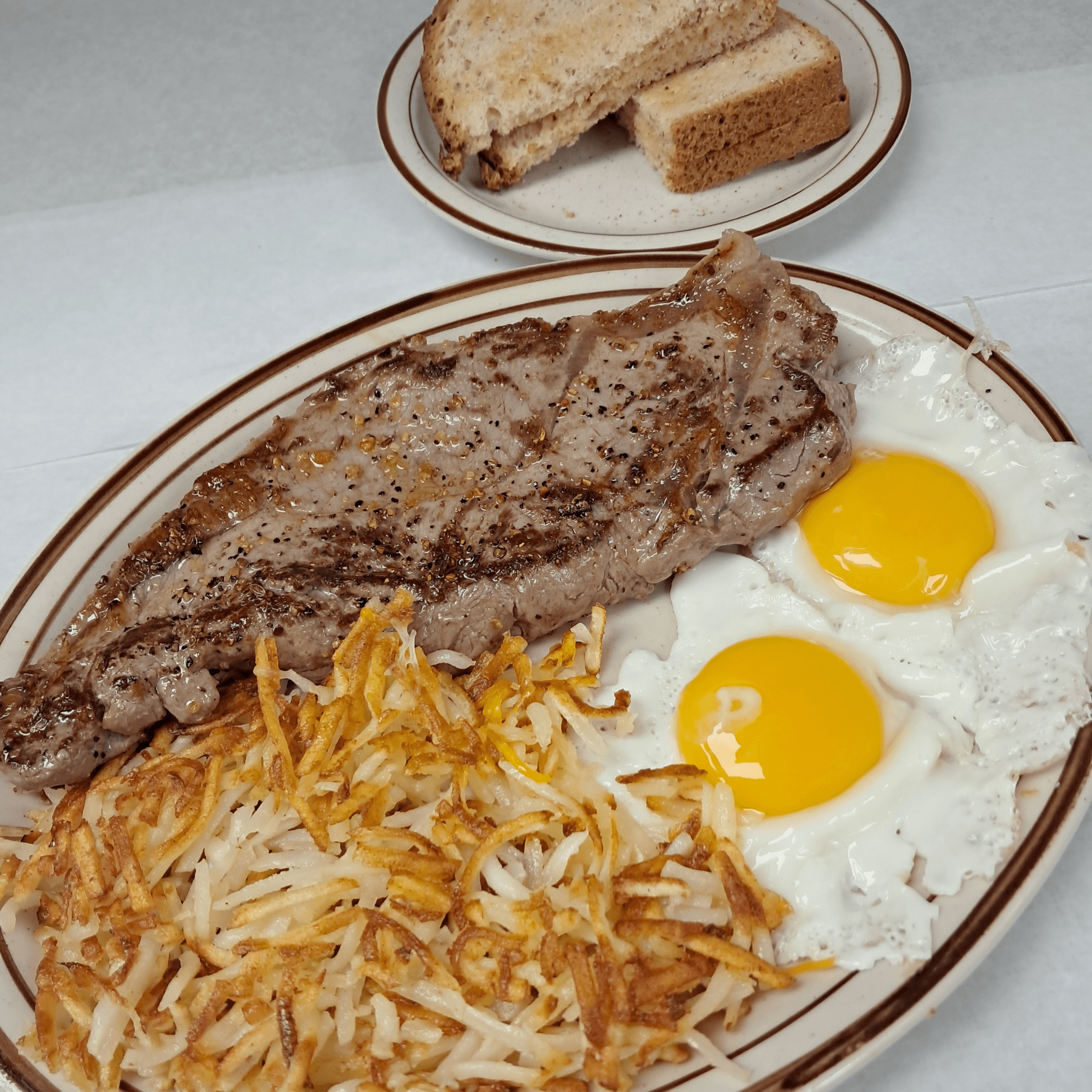 8 oz angus, cream gravy, 2 eggs